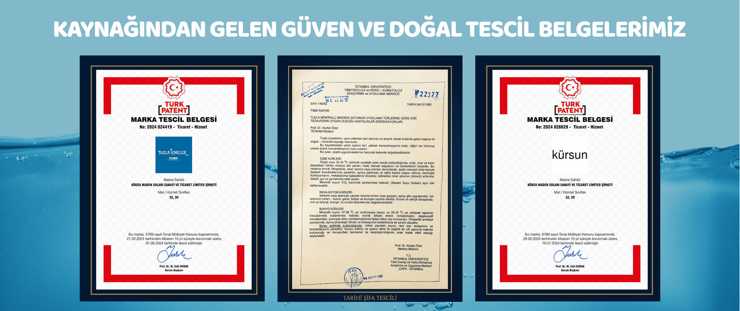 Normal Fiyat 950.00TLTuzla İçmeler Kürsun Doğal Zengin Mineralli Su, 1600’lü yıllardan bu yana şifa arayanların yolu olan Tarihi Tuzla İçmeleri’nden çıkar. İstanbul’un Tuzla ilçesinde, yerin yüzlerce metre altındaki derin mineral katmanlarından doğal yollarla yüzeye ulaşan bu özel su, hiçbir kimyasal işlem görmeden el değmeden doldurulur.